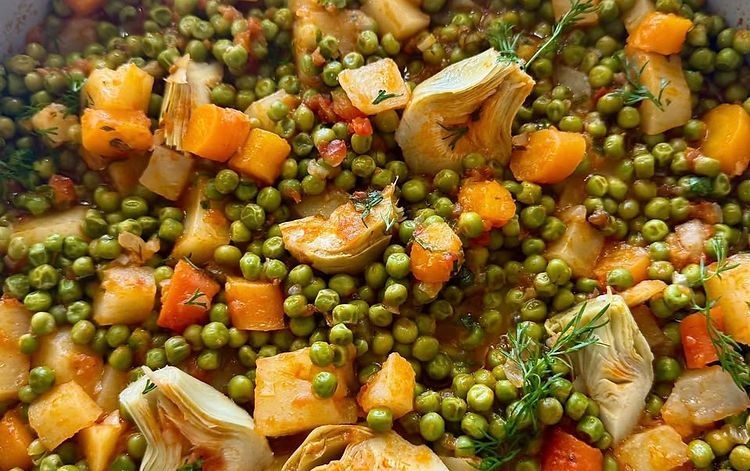Capture the flavors of the Aegean with the simple yet satisfying Greek-style stew. Sweet peas and tender potatoes and carrots come together cooked in a fresh tomatoes and olive oil sauce delicately fragrant with fresh herbs. This quick and easy dish is a popular vegan stew that the Sephardim in Rhodes Island made when peas were in season.